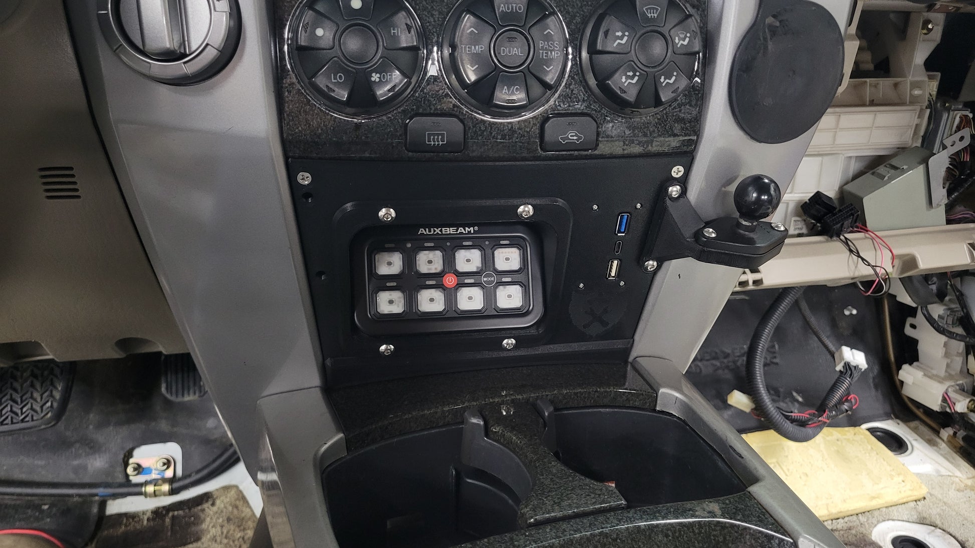 However - Depending on how crafty you get with the wiring of the Auxbeam/Toyota-style switch variant, you *may* need to drill a hole in the backside of the cubby space to run the wires through - don't worry though, if you ever wanted to revert back to the 'OEM' cubby insert, it'd cover up this hole entirely. Â