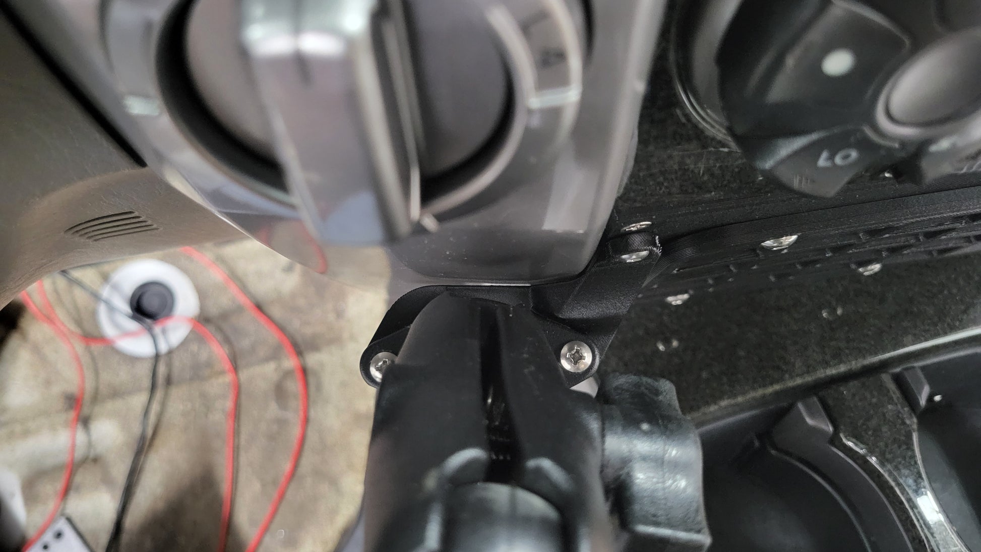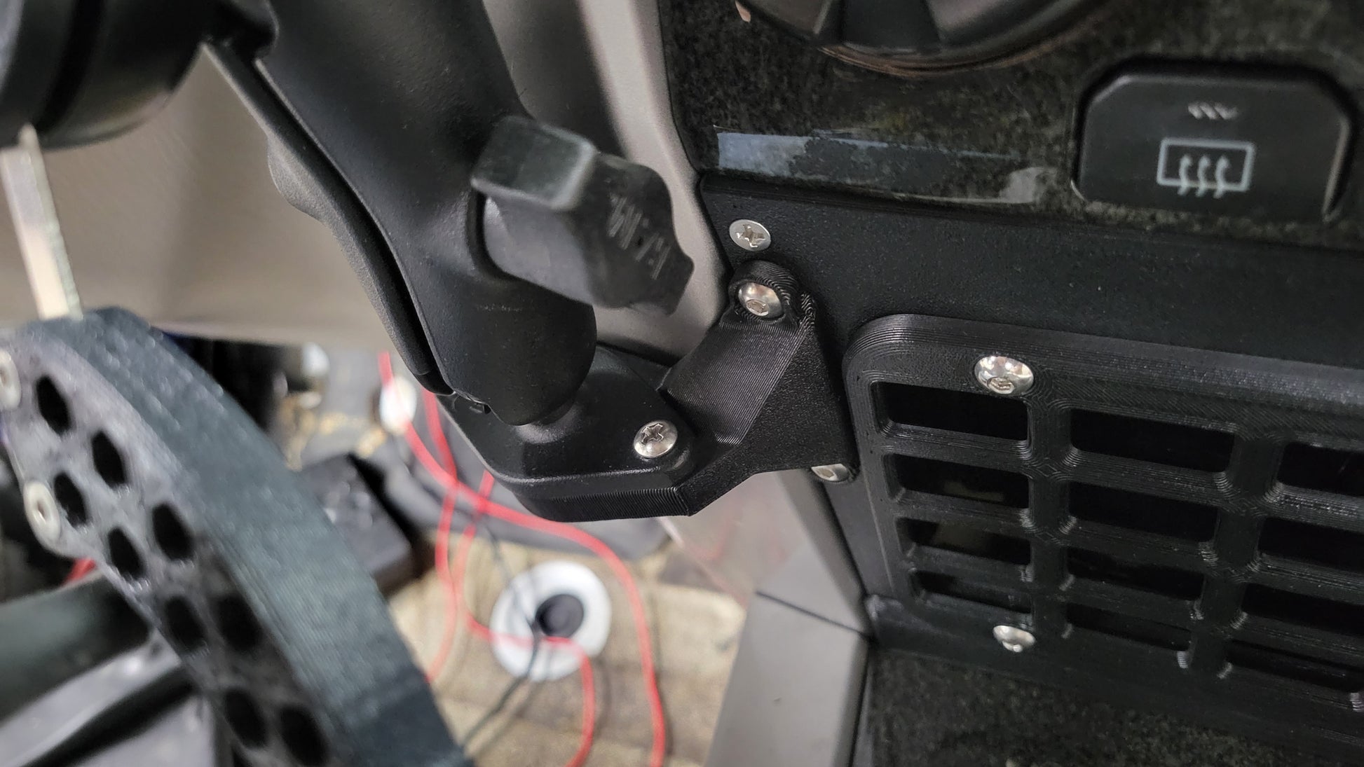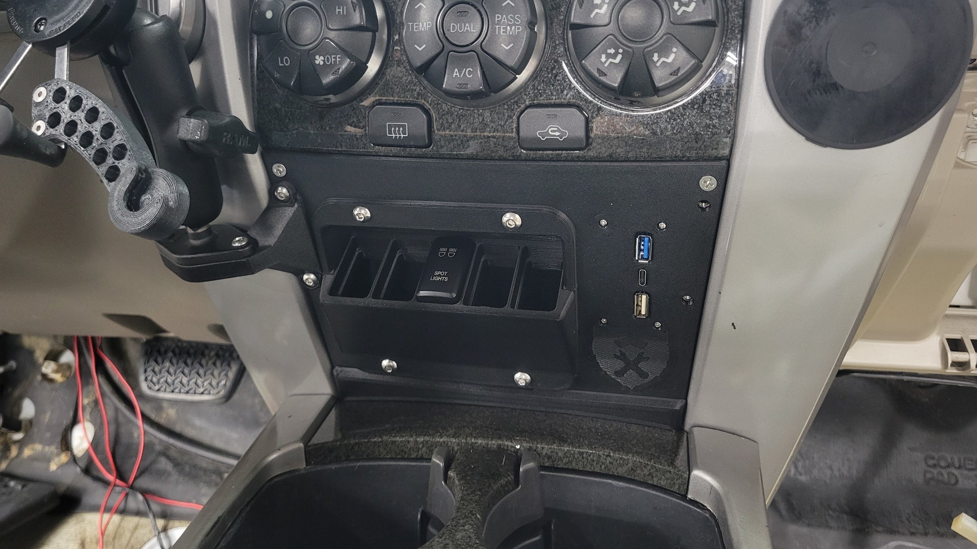 All parts are printed out of carbon-fiber reinforced ASA for long term strength, heat resistance, and UV-stability! Comes with all hardware necessary for use. The integrated USB charger has a pair of wires (positive/negative) that need to get connected to a 12V & ground (respectively) of your choice - that can be with an add-a-fuse at the drivers side fusebox, or the 12V outlet in the center console, etc. You'll need some extra wire to make those connections, just as a FYI.