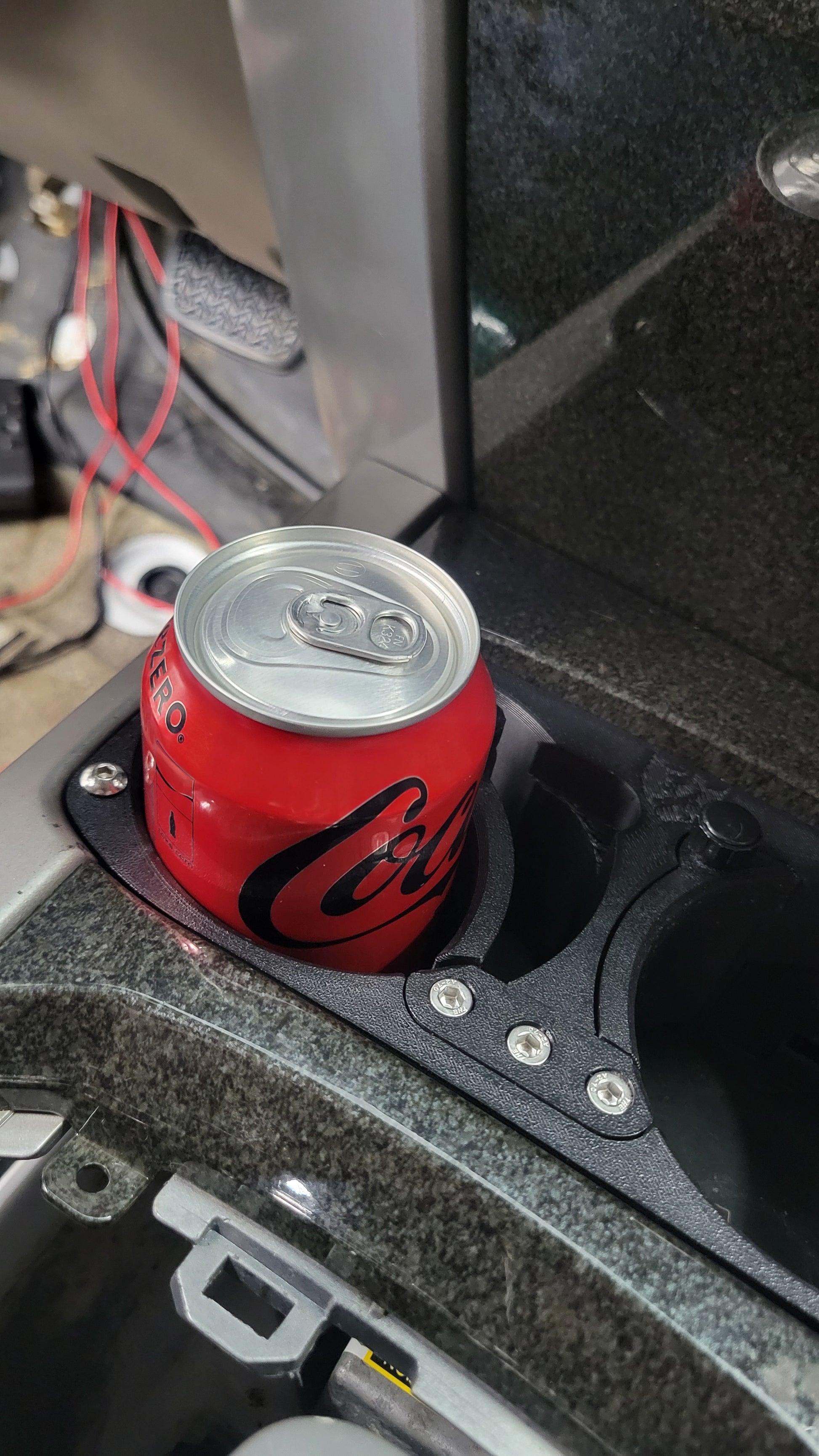 - Passenger Sidecar Cupholder: Add a third cupholder into the mix! This can hold up to a 20 ounce Yeti tumbler. It should be noted that this is engineered to hug the center console trim AS TIGHT as possible, but it does still stick out the ~93mm diameter of the cupholder, so just be cognizant of that. Photos show what would be my normal seating position & how my legs fit in the wheel well.